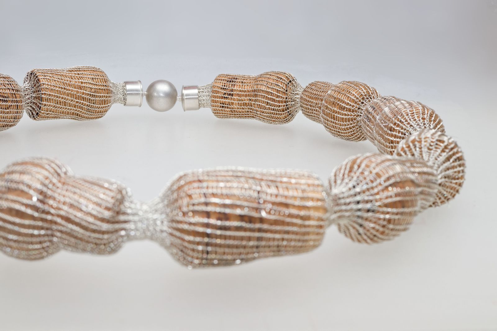 Diese übrig gebliebenen Champagner-Korken, eingestrickt in Silber, stammen alle aus einer Entbindungsstation und bezeugen die kleinen stillen Feiern nach einer Geburt.